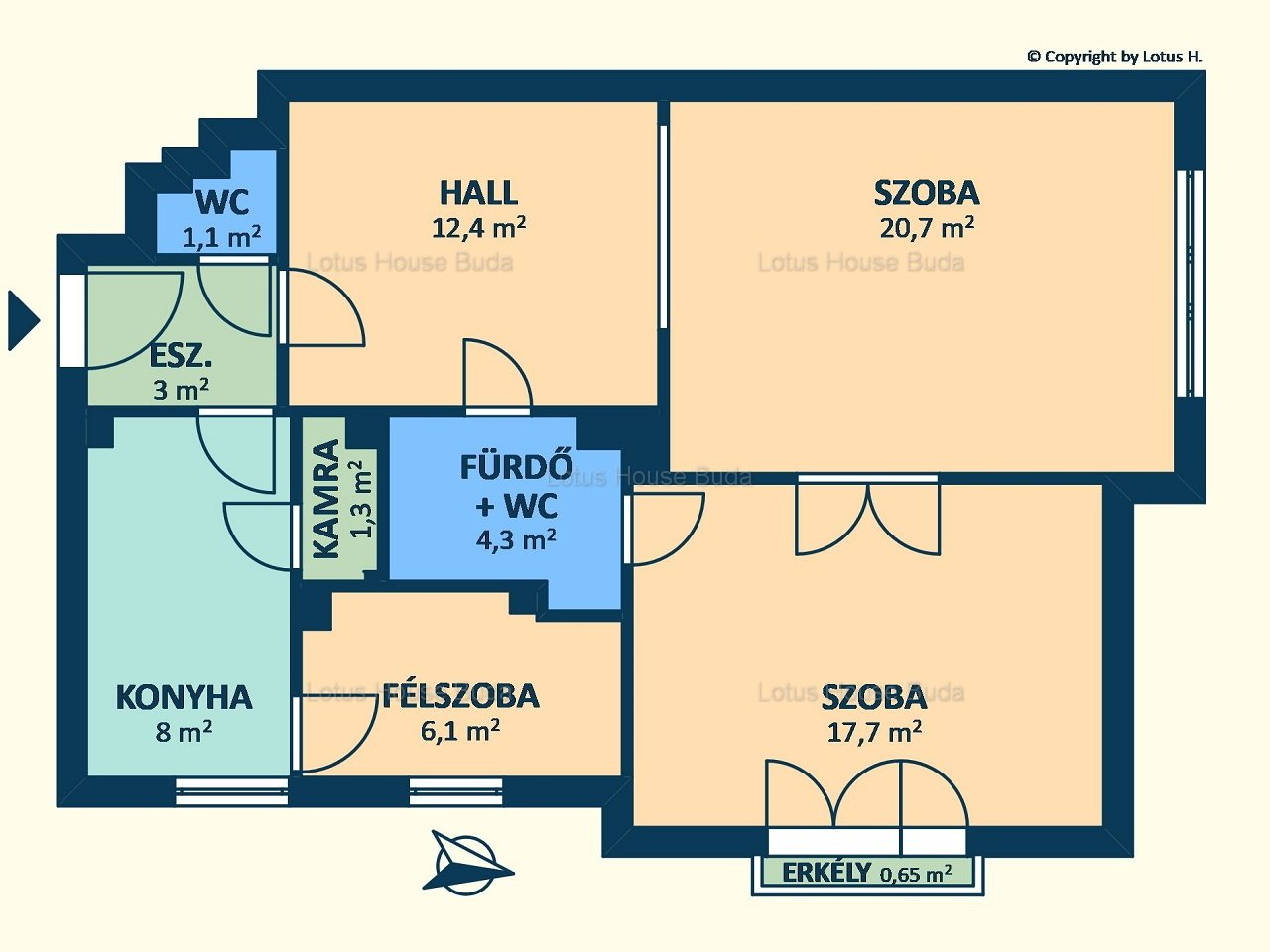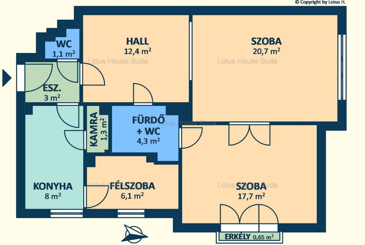 A lakás alapterülete 77nm, melyből a szobák 20,7nm, 17,7nm, a hall 12,4nm, míg a félszoba 6,1nm, a konyha 8nm nagyságú.