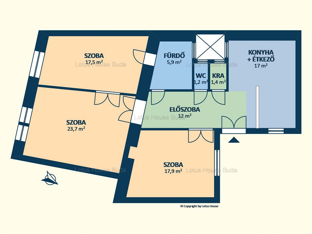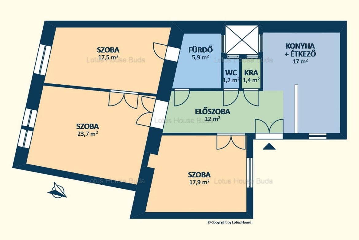 A lakásba belépve az előszoba és az étkezőkonyha tágas légtere fogad minket. Funkciójában a három helyiség jól elválasztott egymástól, amit parapetfal is segít. A lakás eredeti beosztásához képest itt található változás, hiszen a konyha és a cselédszoba, valamint az eredeti előszoba összenyitása eredményezte ezt az igazán hangulatos teret. Az előszoba bal oldalán található az egyik szoba, mag a másik oldalán nyílik a kamra vagy gardrób, WC és a Fürdő. Az előszoba végében nyílik a legnagyobb szoba. A mellette lévő kisebb innen és a fürdőből is elérhető. A lakás valamennyi helyisége kényelmesen berendezhető, jól használható.